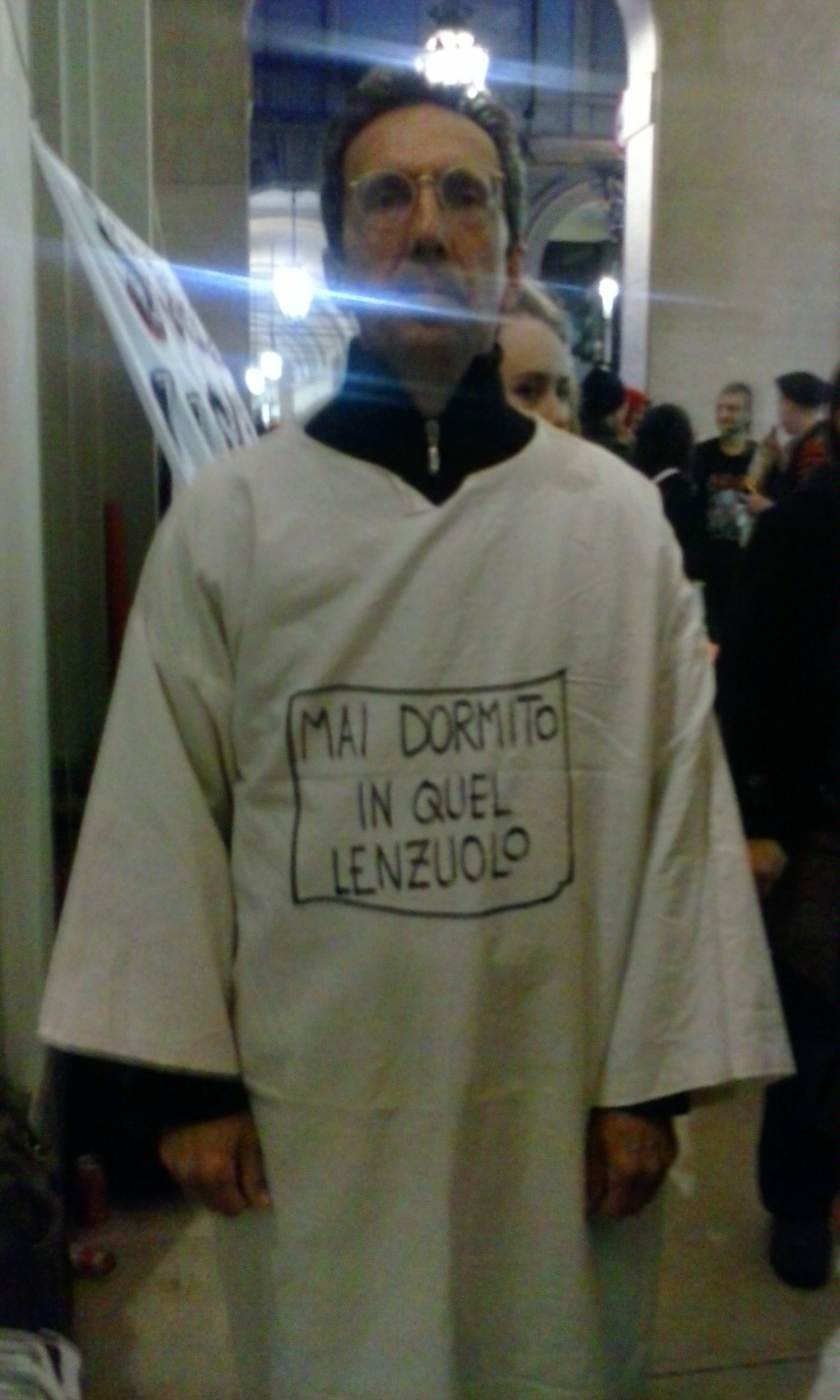 Gli sforzi dei tre sono serviti a poco. Gli anticlericali della Rete No Sindone hanno guadagnato i portici all’angolo tra via Roma e piazza Castello e hanno piazzato banchetti, striscioni, cibarie e sindoni e, tra prefiche, cristi imparruccati, sindoni, frati e drag queen hanno dato il via ad una serata irridente e beffarda.