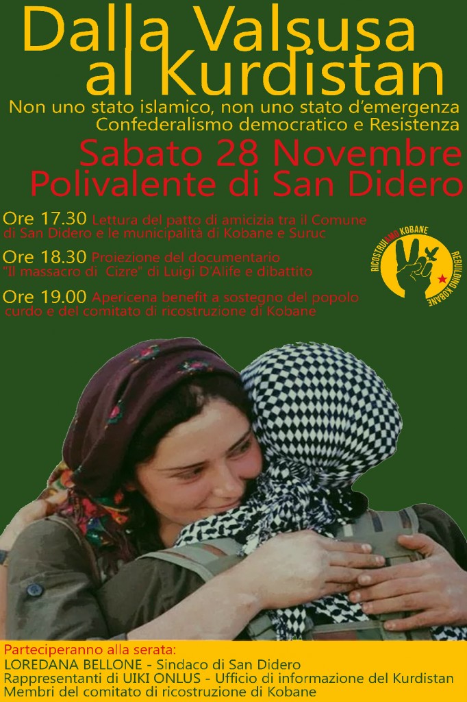 Sabato 28 novembre dalle 17,30 al polivalente di San Didero (Val Susa) si terrà una serata di solidarietà con la Resistenza delle popolazioni del Rojava e del Bakur e del loro progetto di confederalismo democratico.