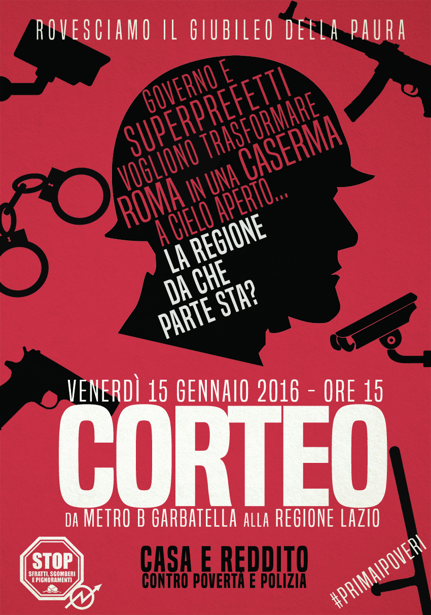 A partire da questo ennesimo caso di sfratto e per continuare a porre l’attenzione sul problema che attanaglia centinaia di famiglie, venerdì 15 gennaio alle ore 15 è stata indetta una manifestazione che, da Metro Garbatella, sfilerà fino alla Regione Lazio sostenendo le ragioni della CASA e del REDDITO contro la povertà e la polizia. Una manifestazione che vuole dare anche un segnale forte contro il Giubileo e il delirio securitario che il Prefetto sta mettendo in campo a Roma, un Giubileo che sempre più puzza di ipocrisia in una metropoli che continua a vedere quotidianamente persone buttate in mezzo alla strada in seguito a sfratti esecutivi.