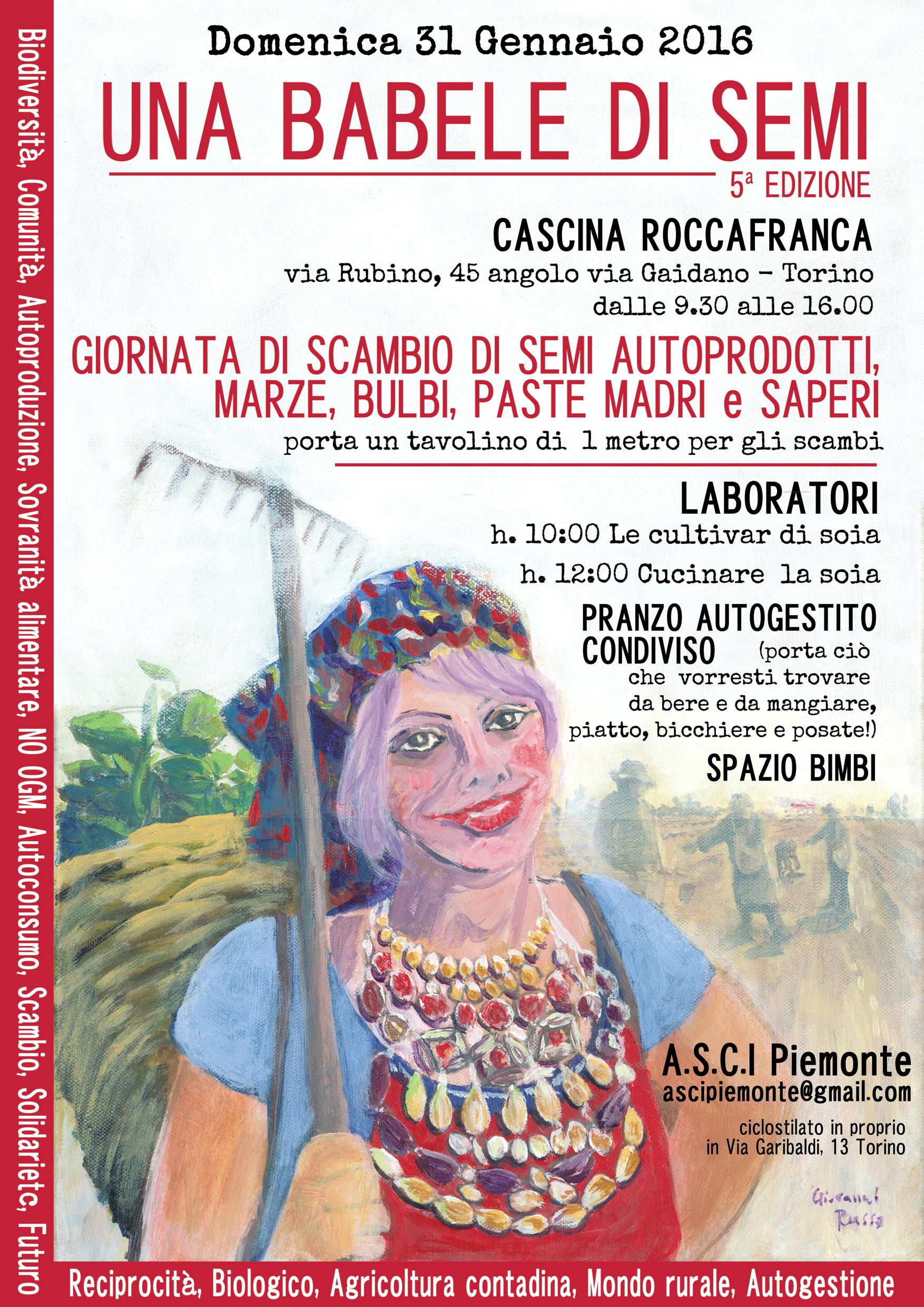 Domenica 31 gennaio dalle 9,30 alle 16 alla cascina Roccafranca (via Rubino 45 – Torino) quinta edizione di “Una Babele di semi”, incontro tra agricoltori professionisti e non per scambiarsi materiale vegetale e conoscenze, all’insegna della biodiversità e dell’autoproduzione. Previsti alcuni laboratori, tra cui uno di cucina per il pranzo condiviso, a base di soia.