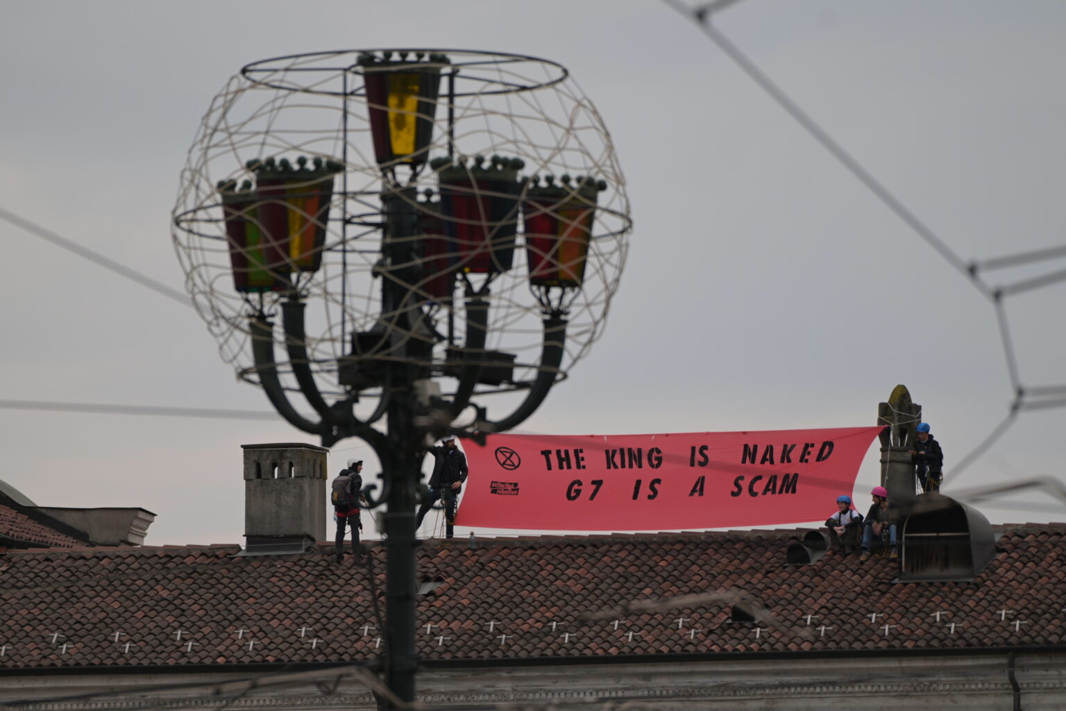 Sin dal pomeriggio di lunedì gli attivisti di Extinction Rebellion, già protagonisti nei giorni scorsi dei diverse azioni contro il G7 come l’occupazione del grattacielo di Intesa-San Paolo, sono riusciti, in barba alla sorveglianza strettissima, a guadagnare il tetto di un edificio di piazza Carlina, di fronte all’albergo dei G7, ed hanno resistito per diverse ore.