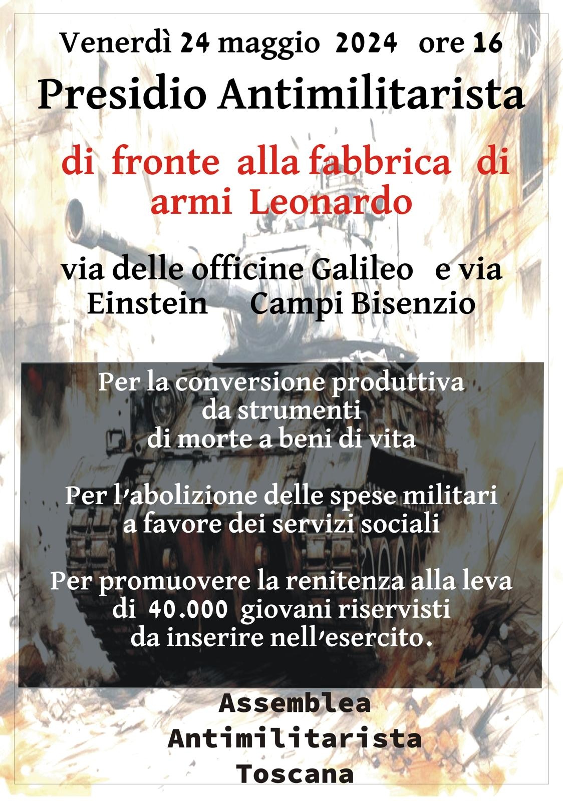 “Venerdì 24 maggio 2024 manifestazione presidio antimiilitarista per la conversione produttiva della Leonardo da fabbrica di armi di morte a fabbrica di beni di vita.