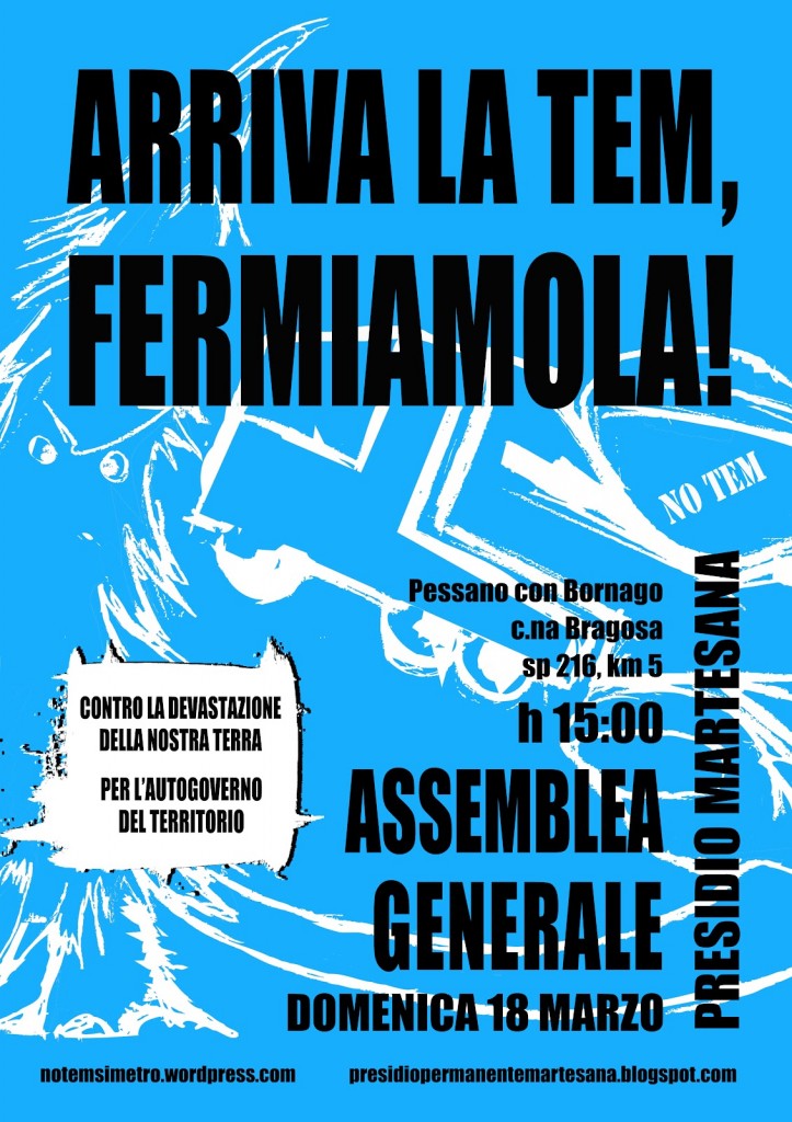 Una nuova ondata di cemento e speculazione si sta per abbattere sulla Martesana: la TEM (tangenziale est esterna milano). Questa nuova infrastruttura si inserisce nel folle piano di Formigoni di trasformare la Martesana nel nuovo polo logistico d’Europa. Assolombarda stima che oltre il 70% delle merci in ingresso e in uscita dall’Italia passerà dall’est milanese(rigorosamente su gomma..). Questa prospettiva di sviluppo distruggerà totalmente il tessuto produttivo locale basato sulla piccola e media impresa, sostituendolo con logistiche, centri commerciali e outlet caratterizzati da lavoro sotto cooperativa, precario e senza nessuna prospettiva per il futuro. Inoltre come tutte le grandi opere anche la TEM è ad altissimo rischio di infiltrazioni mafiose, come è stato recentemente dimostrato con il caso dei cantieri Bre.Be.Mi., imbottiti di amianto, cromo e scarti di acciaierie. Ieri l’assemblea popolare ha visto una partecipazione così numerosa da trasformarsi in un corte. Ne abbiamo parlato con Max Scarica il file