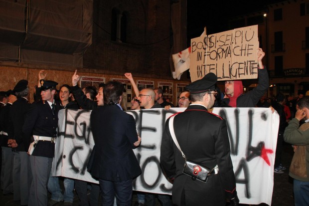 Venerdì 27 Aprile un gruppo di anti-leghisti muniti di striscione: “Lega: predoni a casa nostra”; interrompe Bossi e il suo comizio.