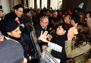 I/le precari /e delle materne e i tanti genitori presenti perché coinvolti da questa decisione del Comune di Torino, indebitato dalle Olimpiadi del 2006 e ora senza soldi, hanno chiesto di poter parlare con un rappresentante dell’amministrazione, che si è però confermata sorda alle esigenze dei cittadini,ottenendo come risposta il muro di scudi dei carabinieri per impedir loro l’entrata nel palazzo comunale.