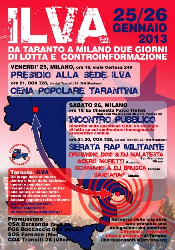 Intervista a Salvatore del Comitato cittadini e lavoratori liberi e pensanti di Taranto sulla due giorni contro l’Ilva a Milano (25-26 gennaio) appena conclusa e sullo stato della lotta nella città, con la partita giocata intorno al prodotto sotto sequestro che i Riva vorrebbero sbloccare e che i lavoratori rivendicano come pegno per i loro stipendi.