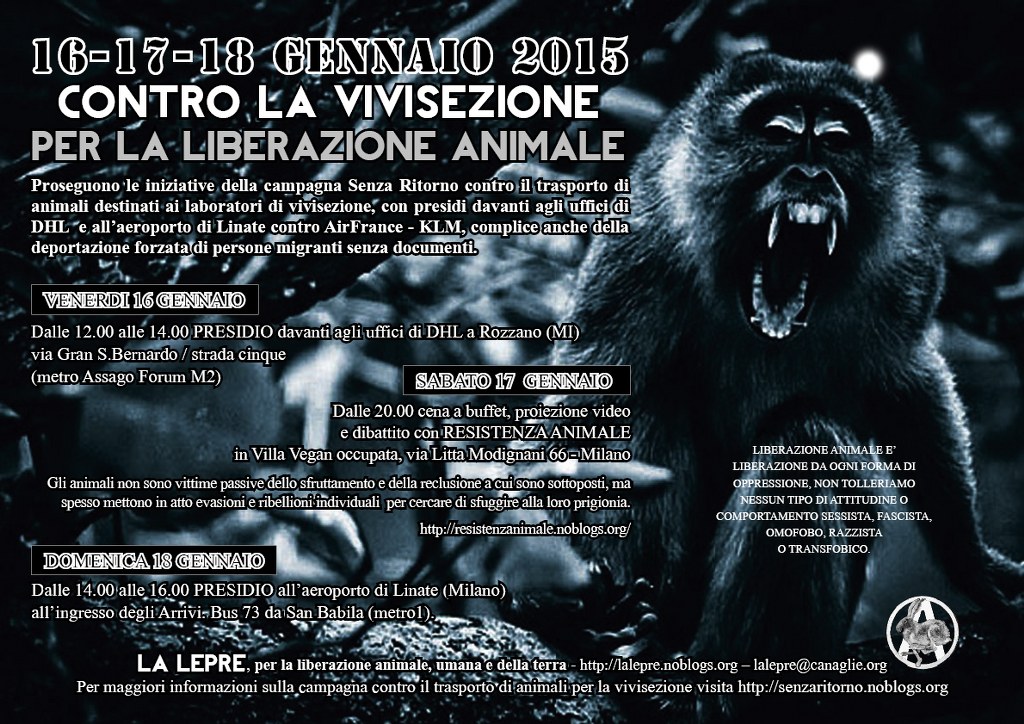 Da ormai oltre un anno la campagna contro il trasporto di animali ‘Senza Ritorno – Gateway to Hell’ va avanti con determinazione anche in Italia con proteste contro le due aziende che al momento sono maggiormente responsabili di questa tratta: Air France – KLM, l’ultima azienda aerea commerciale coinvolta nel trasporto verso i laboratori nonchè responsabile della deportazione di migranti privi di documenti, e DHL principale partner commerciale delll’azienda cargo Abx Air che sta di fatto mantenendo in piedi il rifornimento di animali dal sud est asiatico verso gli Stati Uniti.