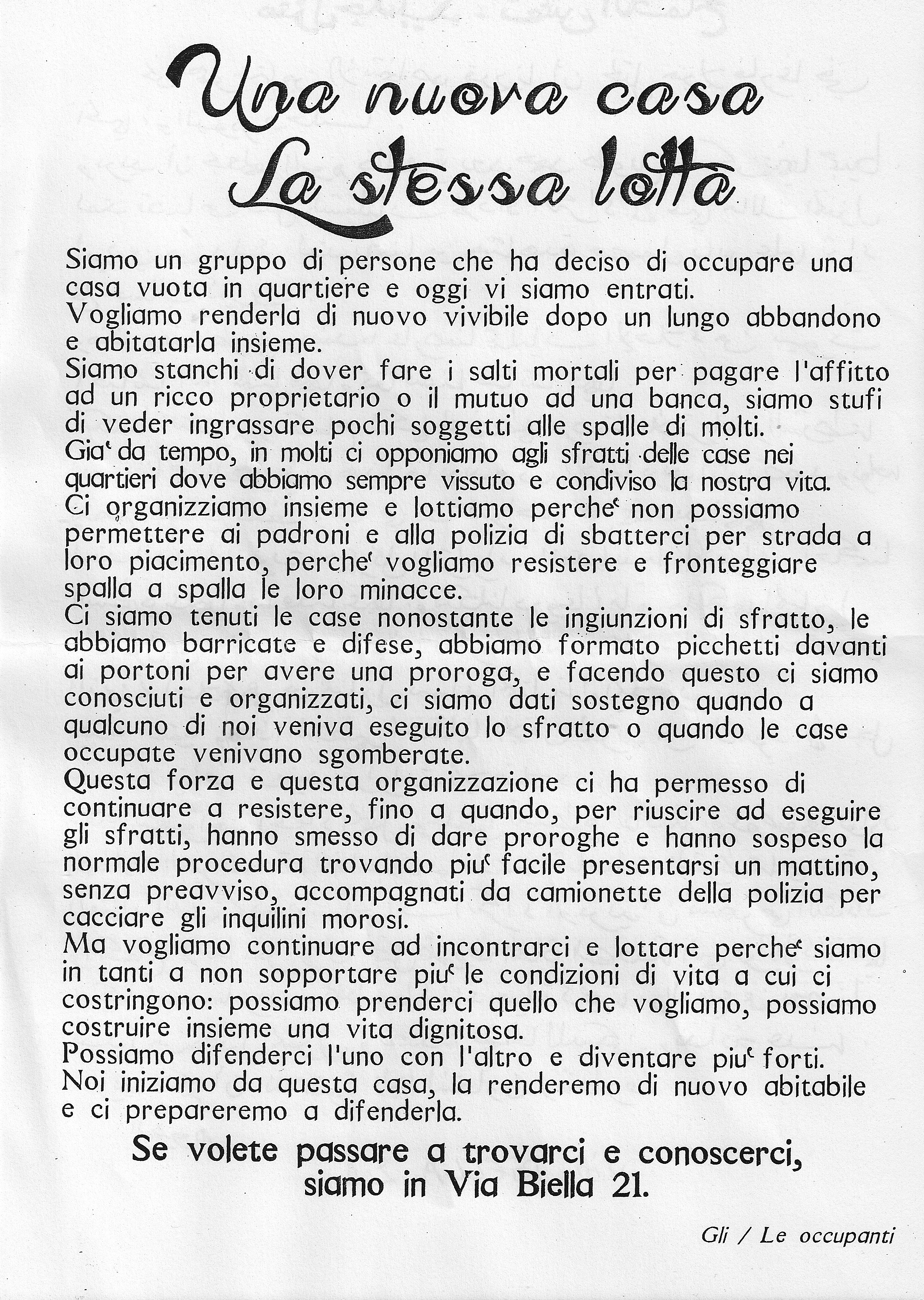 Parliamo in diretta con Abdel dalla nuova occupazione abitativa di Via Biella 21. Da questa mattina sono sette le famiglie che hanno occupato per rivendicare il loro diritto all’abitare. Nello stabile manca a tutto, per questo gli occupanti chiedono solidarietà ed aiuto per sistemare.