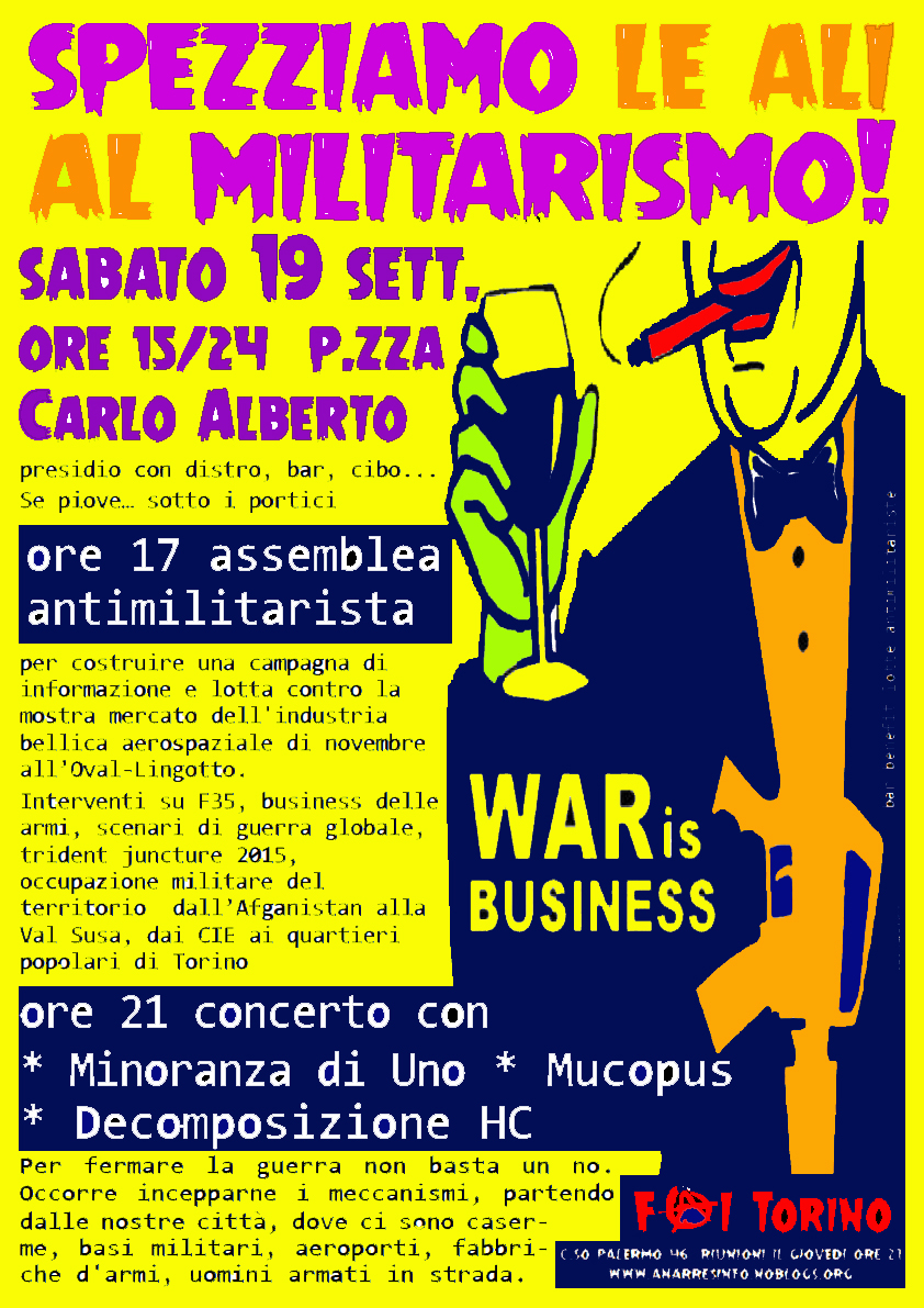 La Federazione anarchica torinese promuove una giornata antimilitarista sabato 19 settembre in piazza Carlo Alberto a Torino. Momento clou alle 17, con un’assemblea aperta verso la mobilitazione contro la mostra mercato.