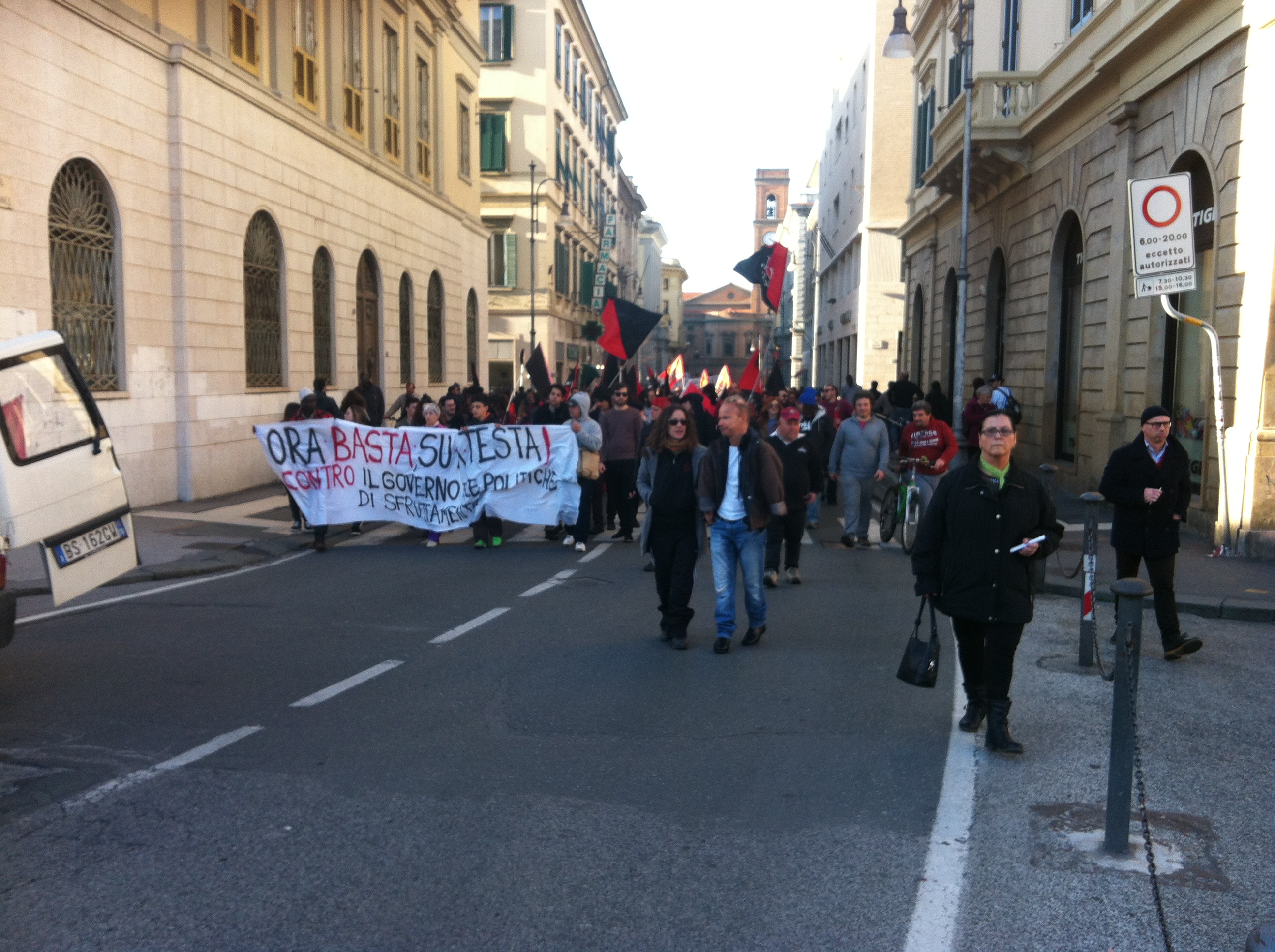 “Disoccupazione, licenziamenti, precarietà, emergenza abitativa, un generale peggioramento delle condizioni di vita e di lavoro, questa è la situazione in cui viviamo a Livorno come in molte altre città. Negli ultimi anni i vari governi che si sono succeduti non hanno fatto che ripetere che per uscire dalla crisi erano necessari dei sacrifici, che i soldi non ci sono. Ma i soldi ci sono sempre per gli industriali, per le banche, per le spese militari, mentre per la scuola, per la sanità, per la casa ci sono solo tagli su tagli. Le spese militari quest’anno ammonteranno a 23,4 miliardi, 64 milioni al giorno, il 10% in più rispetto allo scorso anno, mentre altri miliardi sono pronti per salvare il Monte dei Paschi di Siena. Per gli ammortizzatori sociali invece i soldi sembrano non esserci mai, chi riesce ad accedervi non può sperare in più di qualche centinaio di euro mensili per pochissimi mesi. Lo sappiamo bene pure nel nostro territorio, infatti tra Livorno e Piombino sono molti i lavoratori che perderanno entro l’anno anche queste minime briciole. Questo aggraverà ulteriormente la situazione sociale in città, segnata da una profonda crisi occupazionale e da un’emergenza abitativa che l’amministrazione locale tende ad aggravare.