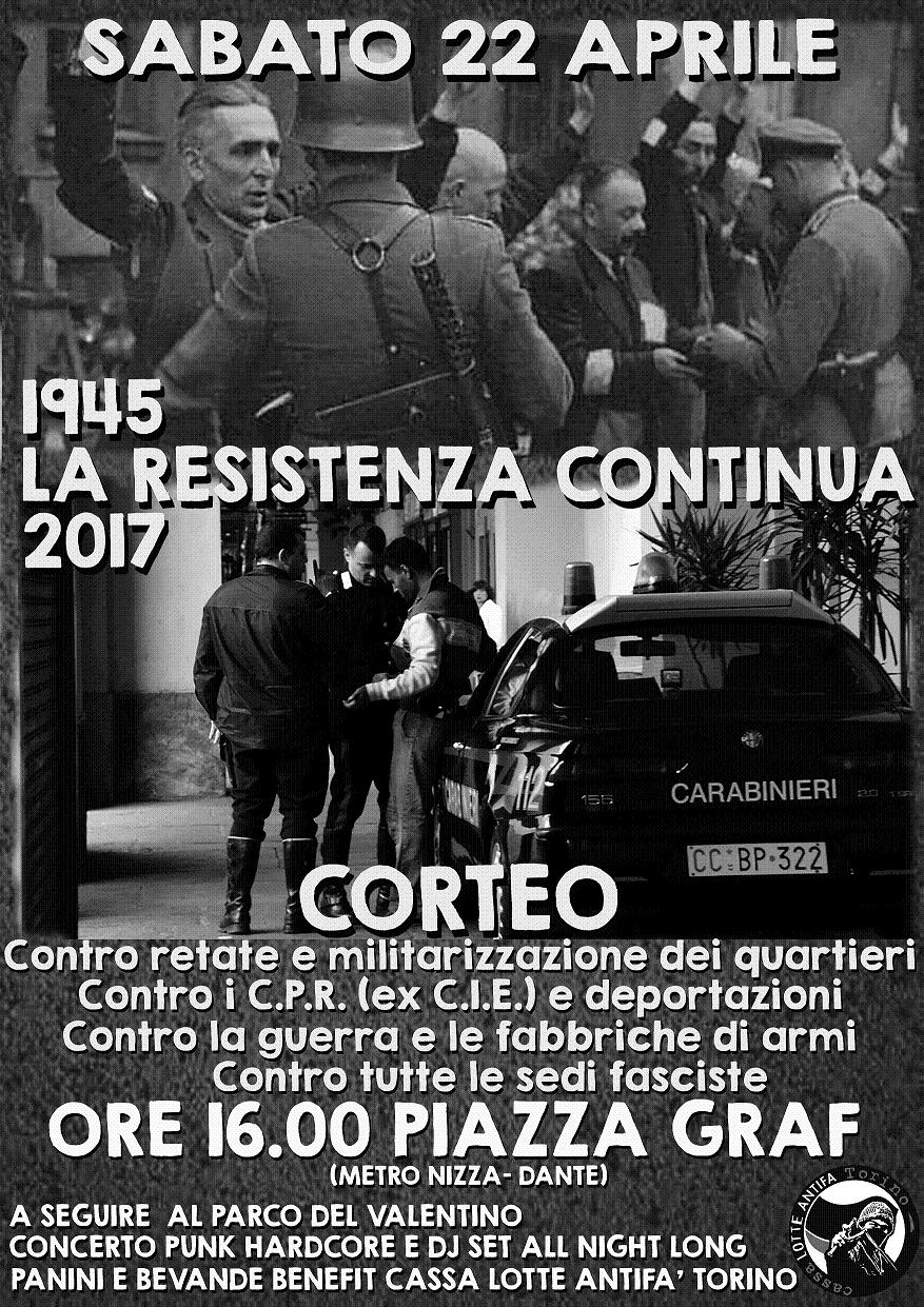 In mezzo a tante polemiche su pretestuose presenze di bandiere sioniste o palestinesi, strategie politichesi di presenze/assenze in piazza per testimoniare uno stantio antifascismo imbalsamato, l’iniziativa degli antifascisti torinesi del quartiere di San Salvario si ammanta di argomentazioni e motivi che attualizzano il bisogno di avversare le pulsioni razziste, militariste… contro le deportazioni, le fabbriche d’armi e la difesa dell’industria del divertimento a pagamento: tutte forme odierne di fascismo.