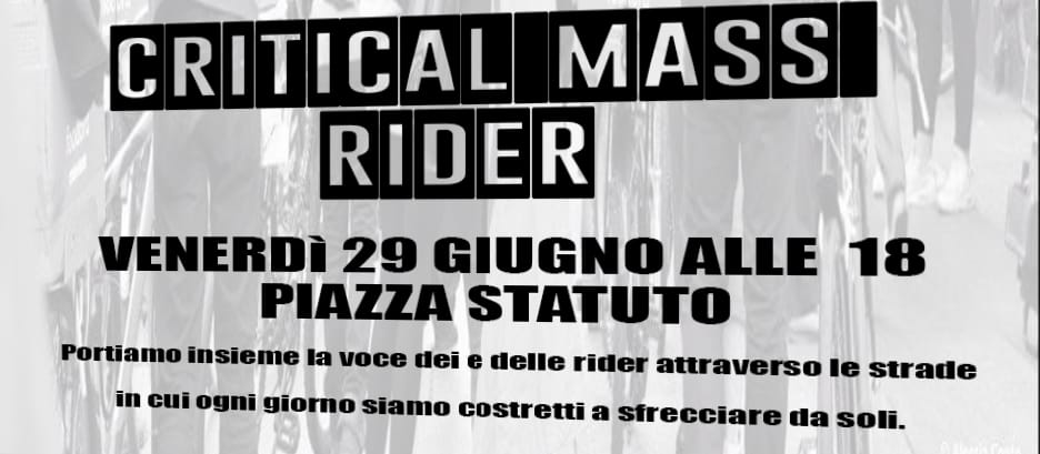 Domani 29 giugno alle 18 partirà da Piazza Statuto una critical mass raider, un corteo in bici volto a stravolgere il traffico cittadino per portare avanti le rivendicazioni che uniscono i lavoratori delle aziende di food delivery torinese, e cogliere l’occasione per conoscere i propri colleghi, sfidando la logica della chiamata “anonima” che fa tante fortune dei padroncini dell’industria 4.0.