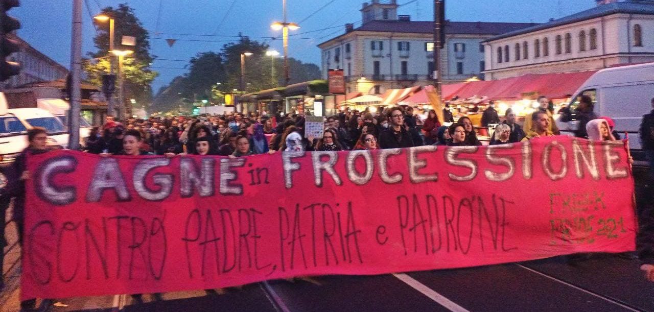 “Cagnә in frocessione contro padre, patria e padrone.”, “le strade sicure le fanno le frociə che le attraversano.”, “identità erranti contro stato, frontiere e polizia” “le libertà non si chiedono, si prendono!” sono alcuni degli striscioni aperti o appesi dalle componenti antiistituzionali.