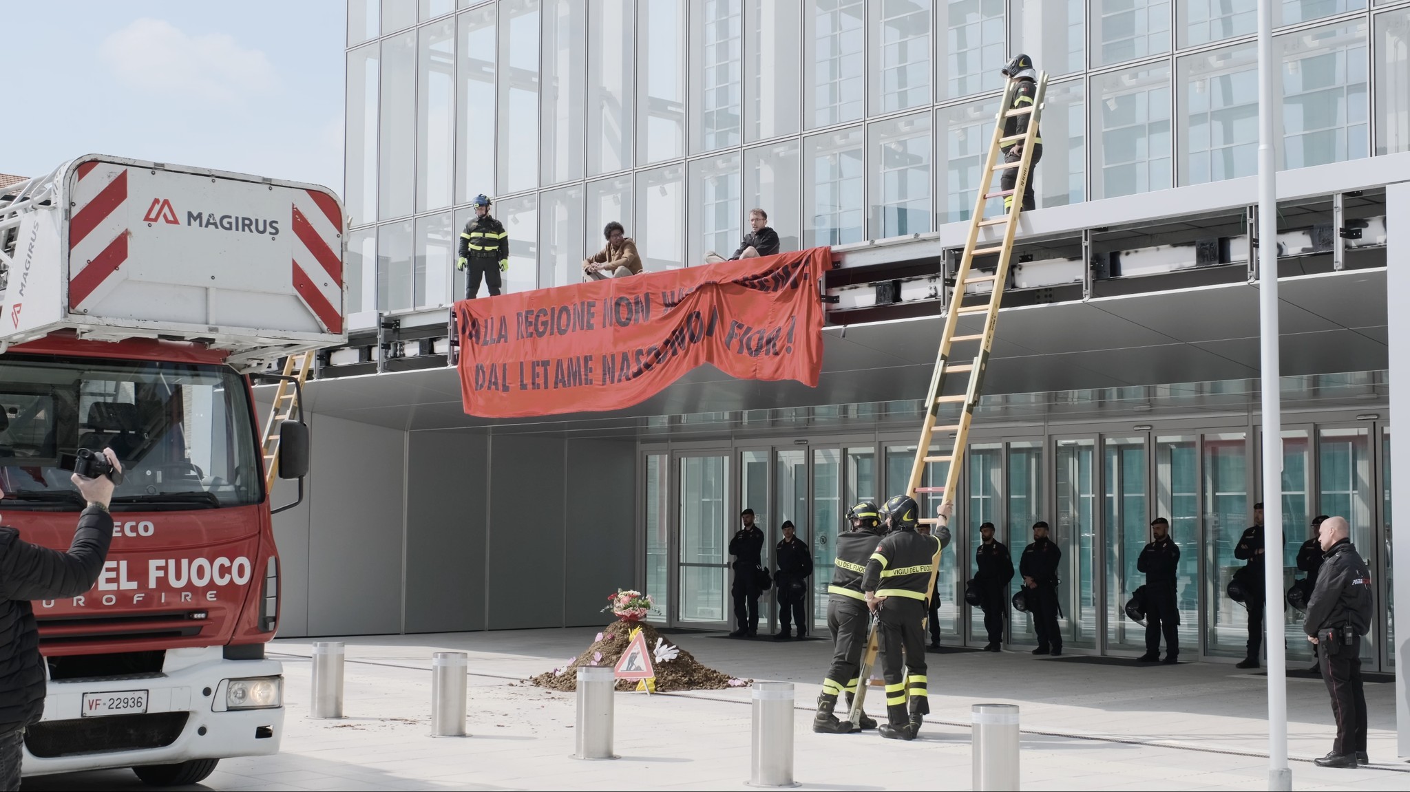 Denunciati gli attivisti di Extinction Rebellion saliti sulla tettoia di ingresso del Grattacielo della Regione a Torino, dopo aver scaricato una montagna di letame ricoperta di fiori. Un’azione dimostrativa, come molte messe in campo dai diversi movimenti per la giustizia climatica, per porre l’attenzione sulla crisi climatica già in atto sul territorio italiano, con una siccità drammatica che dura ormai da più di un anno e che ha provocato miliardi di perdite nel settore agricolo.