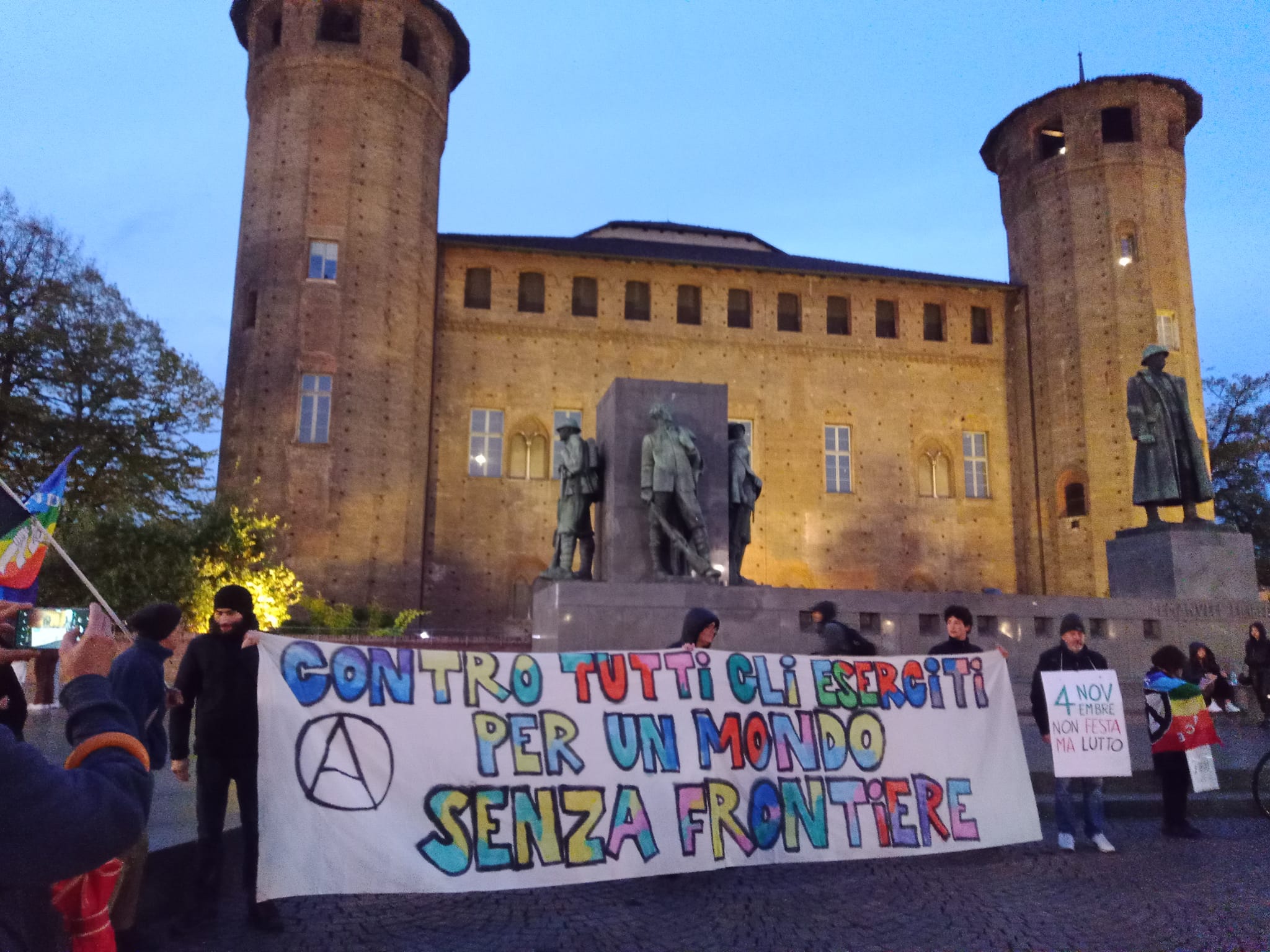 Questo 4 novembre è stata la prima tappa di un mese di lotta ai mercanti di armi, alla produzione bellica, all’avvio dei lavori per la città dell’Aerospazio a Torino.