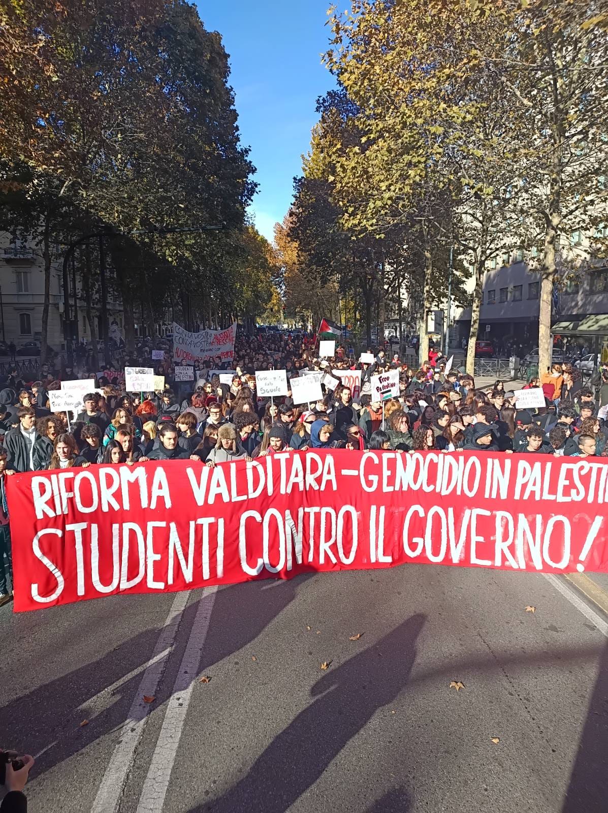 Dall’occupazione di Palazzo Nuovo a sostegno della popolazione palestinese e per l’immediato cessate il fuoco su Gaza, stamattina un numeroso corteo si è riversato nelle strade di Torino, unendosi allo sciopero degli istituti superiori, previsto per oggi, 17 novembre.