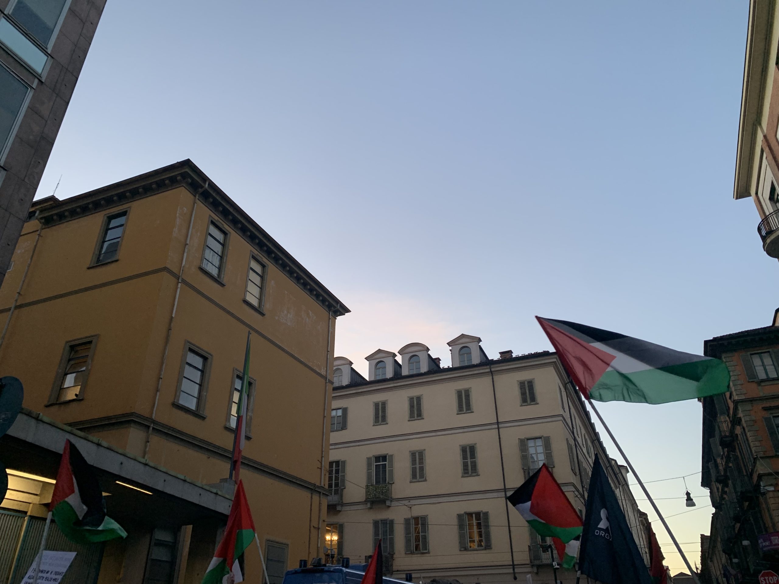 Il presidio è stato subito raggiunto da centinaia di persone, le quali hanno completamente bloccato l’accesso alla sede della RAI su via Verdi con cori e bandiere. Davanti ai cancelli si trovava già schierata la celere in tenuta antisommossa. Dopo un primo momento di interventi al megafono il presidio si è trasformato in un corteo spontaneo per le vie del centro. Con un giro ad anello i manifestanti sono poi tornati davanti alla RAI. Ad attenderli tre blindati e agenti con scudi e manganelli in mano, i quali non hanno atteso a lungo per effettuare delle cariche, una di seguito all’altra, a cui chi era in strada ha risposto compatto, rimanendo davanti all’ingresso. Solo molti minuti dopo il corteo è ripartito, fermandosi davanti al McDonald di via Sant’Ottavio per esprire il proprio dissenso all’appoggio dato dall’azienda all’esercito Israeliano, e terminando in Piazza Castello.