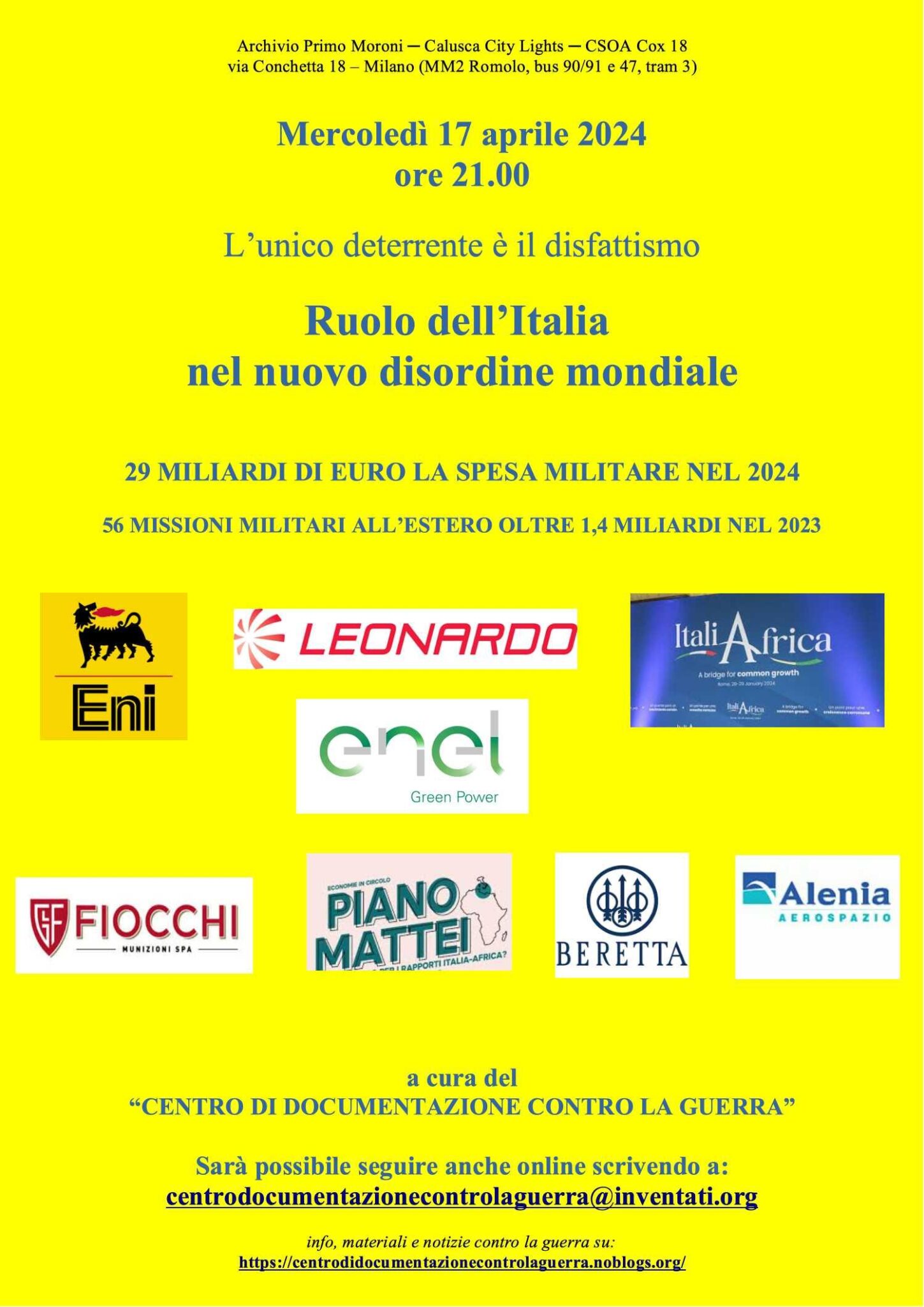 Di seguito alcuni estratti dall’incontro “Ruolo dell’Italia nel nuovo disordine mondiale. L’unico deterrente è il disfattismo” a cura del Centro di documentazione contro la guerra, che si è tenuto il 17 aprile a Milano presso Archivio Primo Moroni – Calusca City Lights – CSOA Cox 18