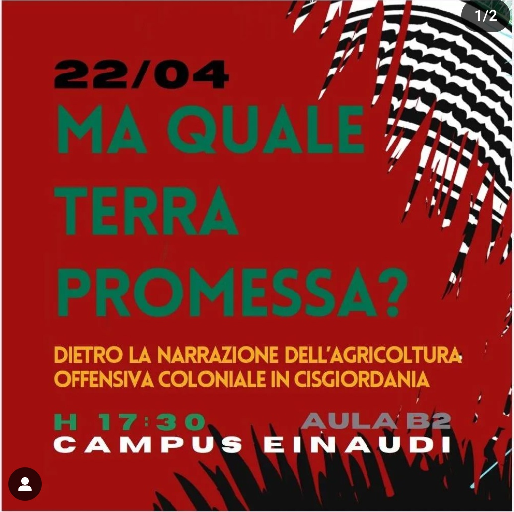 Se ne è parlato al Campus Einaudi il 22 aprile, in occasone dell’incontro “Ma quale terra promessa? Dietro la narrazione dell’agricoltura offensiva coloniale in Cisgiordania”, organizzato dai collettivi di Ecologia Politica e Progetto Palestina, che ringraziamo per la disponibilità alla diffusione: