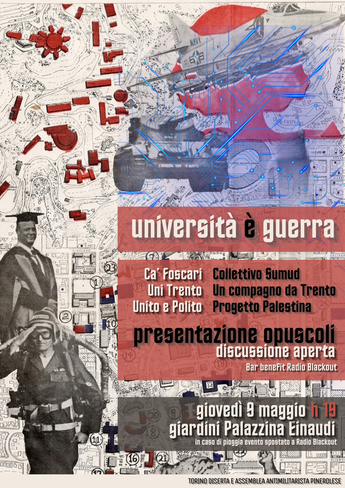 Unito, il Politecnico di Torino, l’Università Ca’ Foscari di Venezia e l’Università di Trento, casi specifici da cui si rende evidente una forma generale, incarnano un modello di produzione materiale e culturale che perfeziona e catalizza la logica della guerra, rivolta sia ai nemici interni, che all’esterno dei confini statuali. La presentazione di opuscoli scritti da studenti a Venezia, Trento e Torino vuole quindi fare emergere il ruolo che l’Università come istituzione e quindi nodo fondamentale di un sistema di rapporti sociali riveste nella continua produzione e riproduzione della guerra nei luoghi in cui viviamo. Dire università e sapere scientifico è dire guerra.”