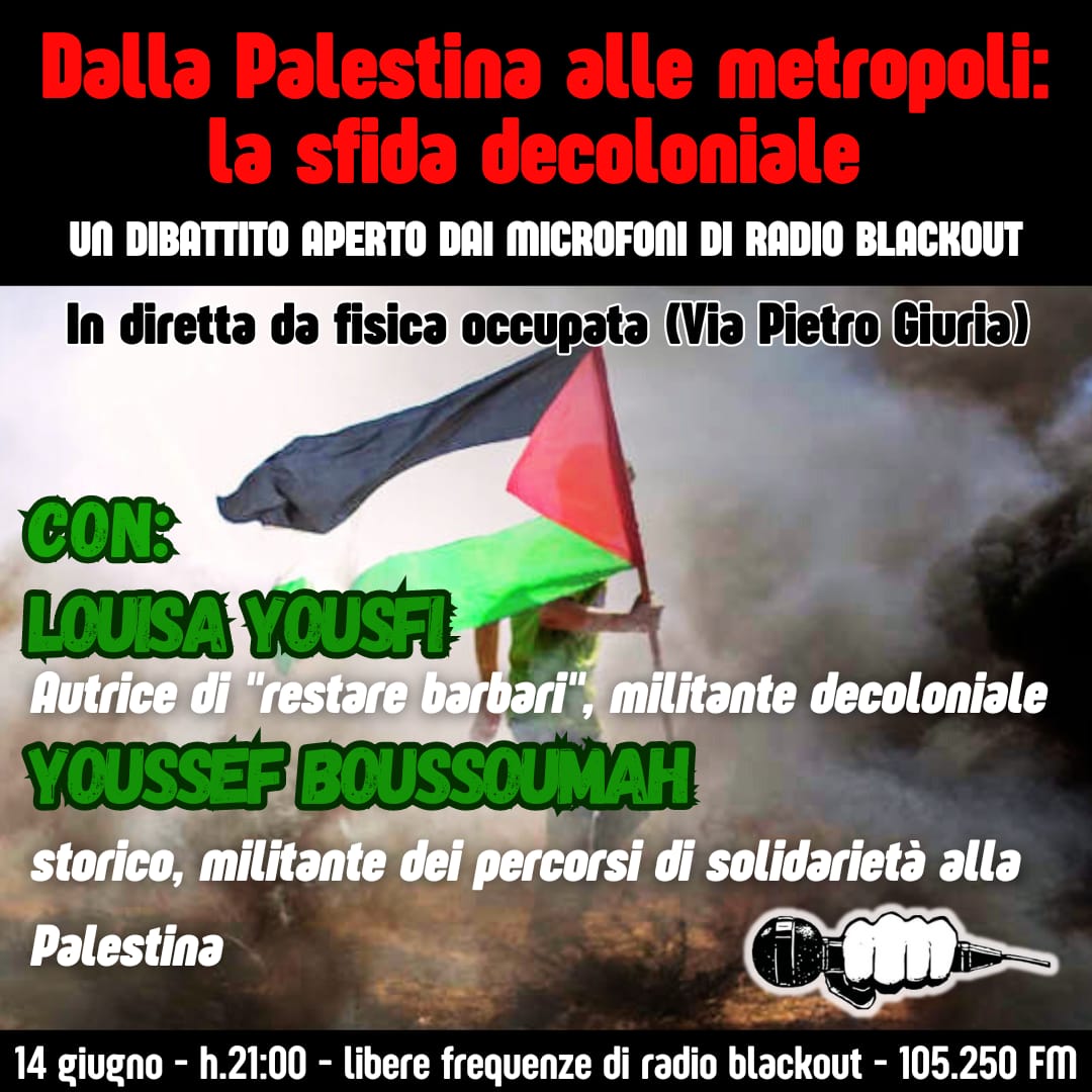 In diretta con lo studio mobile di Radio Blackout dalla facoltà di Fisica occupata ormai da un mese in sostegno alla lotta di liberazione del popolo palestinese e contro il genocidio israeliano, una puntata speciale a cura della redazione informativa di Radio Blackout. In collegamento sui 105,250 LOUISA YOUSFI e YOUSSEF BOUSSOUMAH, militanti decoloniali attivi/e in Francia nei percorsi di solidarietà con la Palestina, nelle lotte del proletariato coloniale nelle metropoli francesi e contro le politiche razziste della Republique, in un dibattito aperto con gli studenti e le studentesse occupanti della facoltà.