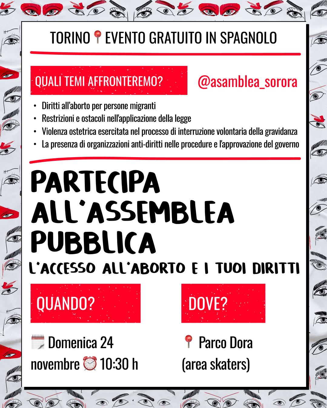 L’ Asamblea Sorora invita la comunità dell’America Latina (e non solo!) a riflettere sull’accesso all’aborto in occasione di un’assemblea pubblica che si terrà domenica 24 novembre a partire dalle 10:30 a Parco Dora. Ne parliamo con tre compagne del collettivo che ci raccontano dell’importanza di mettere al centro questo tema nei giorni di avvicinamento alla giornata internazionale per l’eliminazione della violenza di genere e contro le donne (25 novembre). Il loro lavoro sul territorio ha fatto emergere l’esigenza di creare momenti di discussione dedicati come questo, dove si tratterà, in spagnolo, del diritto all’aborto per persone migranti e di come far fronte comune di fronte a restrizioni, ostacoli e violenza medica. Più in generale, Asamblea Sorora porta avanti occasioni di incontro, confronto e resistenza che emergono dall’esigenza di alimentare reti di mutuo aiuto tra persone dell’America Latina a Torino e dalla necessità di coltivare e diffondere un approccio transfemminista e antirazzista di fronte ai problemi di tutti i giorni – anche attraverso il loro intervento nelle scuole.