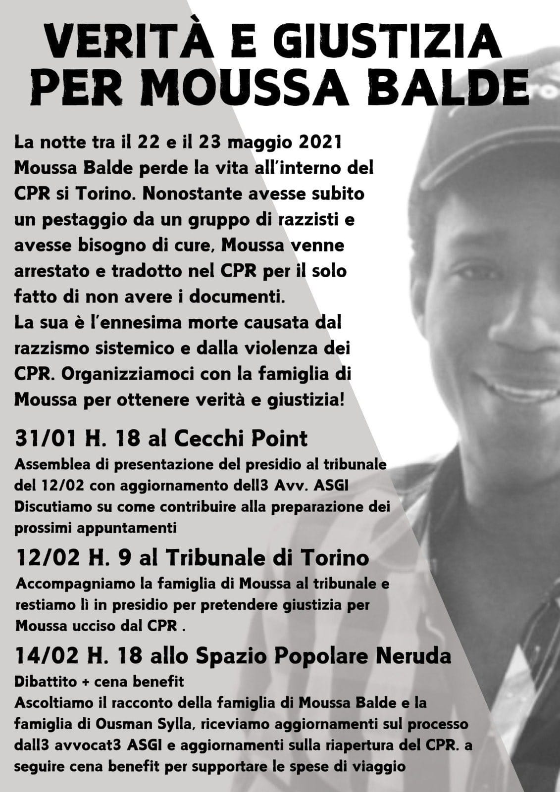 Il 12 febbraio inizia la fase dibattimentale del processo per la morte di Moussa Balde, trovato morto nella notte fra il 22 e il 23 maggio 2021 dentro il CPR di Torino. Moussa, ricordiamolo, era stato aggredito da un gruppo di razzisti nella città di Ventimiglia, lì era stato arrestato e portato nel CPR di c.so Brunelleschi per il solo fatto di non avere i documenti. Una volta nel CPR è stato messo nell’ospedaletto, struttura separata, in isolamento, una prigione nella prigione, dove nel 2019 morì anche Faisal Hussein dopo quasi sei mesi ininterrotti di isolamento. Anche Moussa non ha ricevuto le cure necessarie per il suo stato di salute. Anche Moussa muore in isolamento, quella notte. Si parlerà di suicidio, ma l’unica evidenza è l’assenza di cura di un sistema che pratica solo morte e tortura.