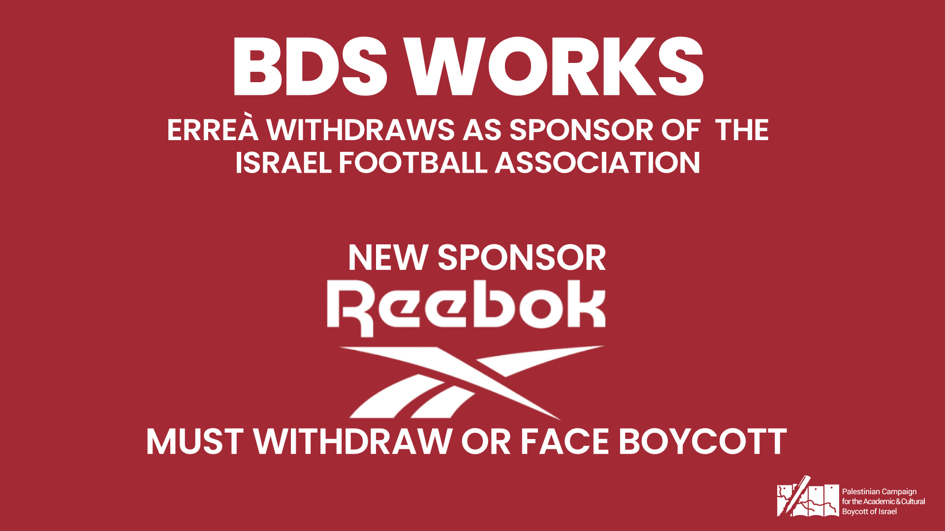 In seguito alle richieste di boicottaggio, l’azienda italiana di abbigliamento sportivo Errea si è ritirata da un contratto di sponsorizzazione con la Israel Football Association. I palestinesi esortano il nuovo sponsor Reebok a ritirarsi o ad affrontare boicottaggi, come Erreà, PUMA e Adidas prima di loro. Il genocidio israeliano a Gaza ha ucciso decine di migliaia di palestinesi, tra cui almeno 715 atleti e calciatori palestinesi, e ha distrutto o danneggiato tutte le strutture sportive palestinesi a Gaza, tra cui stadi, palestre e club, alcuni dei quali sono stati utilizzati come campi di detenzione e tortura. L’IFA è direttamente complice del regime di apartheid decennale di Israele e dell’occupazione militare e, più di recente, del suo genocidio a Gaza. L’IFA include nei suoi campionati ufficiali squadre con sede in insediamenti israeliani illegali su terre palestinesi occupate e sostiene, insieme al governo israeliano, il loro mantenimento. Sotto pressione dalle crescenti richieste di boicottaggio, Erreà si è svincolata dal contratto. Una vittoria per il movimento BDS.