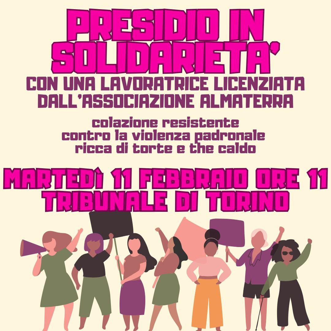 Domani, martedì 11 febbraio, alle ore 11, ci sarà un presidio di fronte al Palazzo di giustizia di Torino per portare solidarietà ad una delle ex-lavoratrici di Almaterra licenziate, in occasione della prima udienza che darà inizio alla parte della vertenza contro l’associazione, per ribadire la necessità di contrastare in ogni contesto l’isolamento e l’invisibilizzazione dello sfruttamento lavorativo e l’esigenza di rispondere con rabbia e determinazione alle condizioni lavorative precarie e frustranti imposte in tanti luoghi di lavoro, e in maniera subdola e ricattatoria nel terzo settore, sotto la maschera della passione o della vocazione nel lavoro di cura.