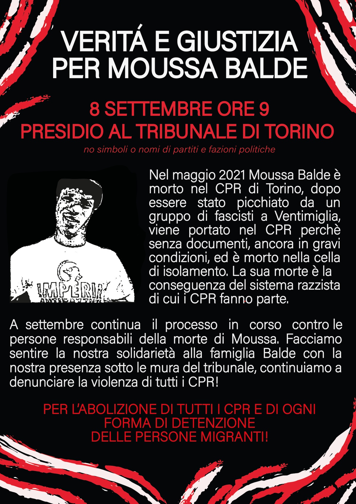 A 4 anni dagli eventi inizia il processo ai CPR, il processo più importante mai fatto in Italia contro il sistema dei CPR, al tribunale di Torino. Il 12 febbraio di quest’anno si è tenuta l’udienza preliminare del procedimento per omicidio colposo a carico della ex direttrice del CPR e del medico direttore sanitario della struttura all’epoca della morte di Moussa Balde. Il 22 settembre si terrà la seconda udienza e saranno presenti i genitori di Moussa: facciamoci sentire per sostenere la famiglia Balde nella lotta comune contro i CPR!