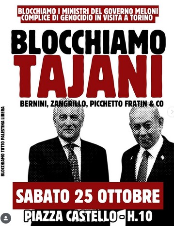 Sabato 25 Ottobre il ministro degli esteri Tajani e altri ministri italiani saranno ospiti a Torino. Una manifestazione è stata indetta per contestare la loro presenza come esponenti del Governo Meloni, complice di Israele nel genocidio in Palestina. Dopo la contestazione, è previsto un momento di socialità e presidio in Piazza Castello.