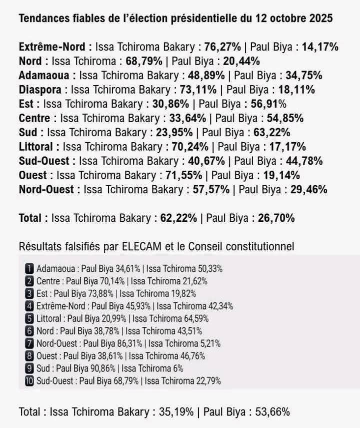 I conteggi elettorali prodotti dalle opposizioni, attraverso il monitoraggio dei propri scrutatori, riportano un risultano totalmente ribaltato in confronto a quello ufficiale che riconosce Biya vincitore.
