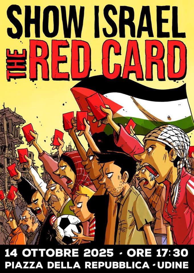 Domani, 14 ottobre, alle 20:45, si giocherà a Udine Italia–Israele, match di qualificazione ai Mondiali 2026. Una partita che si terrà nonostante le proteste e le richieste di esclusione della nazionale israeliana, ignorate dalla FIFA, dalla FIGC e dagli addetti ai lavori. Una squadra che rappresenta pienamente i valori del sionismo e non ha mai preso le distanze dal genocidio e dalle violenze quotidiane contro il popolo palestinese.