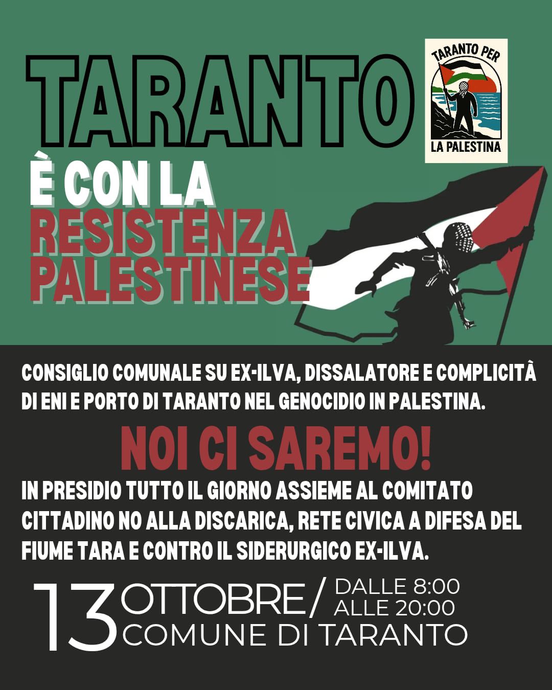 Presidio sotto il Comune di Taranto, questo lunedì 13 ottobre, dalle ore 08:00 alle 20:00 contro la complicità di Eni e del porto di Taranto con il genocidio palestinese, l’AIA e il dissalatore.