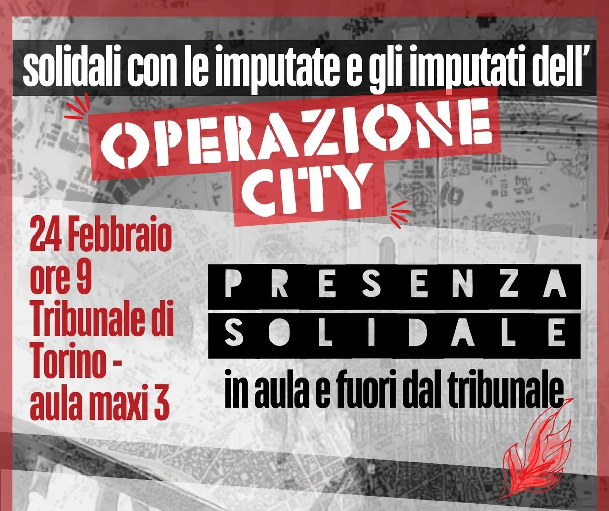 Martedì 24 febbraio h9 le compagne e i compagni imputati nell’operazione City hanno chiamato una presenza solidale dentro e fuori il Tribunale di Torino, in occasione di una delle ultime udienze dell’istruttoria dibattimentale del processo che vede oltre 70 persone imputate per il corteo del 4 marzo 2023.