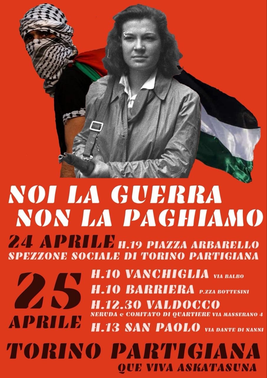 Da dopo la manifestazione nazionale del 31 gennaio, i collettivi e i comitati che compongono l’assemblea Torino Partigiana riattraversano le strade del quartiere Vanchiglia, che da dopo lo sgombero del Centro Sociale Askatasuna vive una situazione di militarizzazione senza precedenti, e della città. Il primo appuntamento è il festival “Altri Mondi-Altri Modi” in piazza Santa Giulia (si sarebbe dovuto inizialmente tenere in via Balbo, location però vietata da una nervosa Questura), proseguendo con la presenza dietro lo striscione “Torino Partigiana” alla fiaccolata cittadina del 24 aprile e con il corteo alle lapidi partigiane in quartiere la mattina del 25. Il primo maggio, da Piazza Vittorio partirà lo spezzone sociale “La loro guerra non la paghiamo” – contro la guerra infinita, il caro-vita e la militarizzazione delle città.