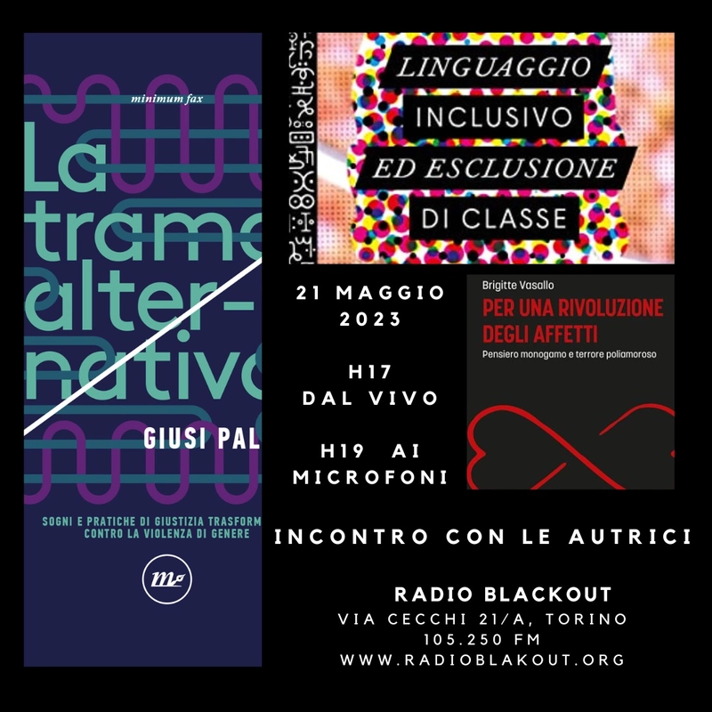 Doppio appuntamento per discutere con le autrici Giusi Palomba ("La trama alternativa", Minimum fax) e Brigitte Vasallo ("Per una rivoluzione degli affetti – Pensiero monogamo e terrore poliamoroso", effequ e "Linguaggio inclusivo ed esclusione di classe", Tamu).