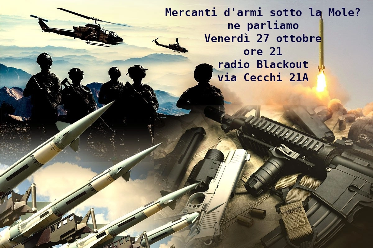 Venerdì 27 ottobre ore 21 radio Blackout via Cecchi 21A Torino diventerà la città delle armi? La nascita del nuovo Polo bellico, la mostra-mercato di caccia e droni da guerra, lo sbarco della Nato sotto la Mole. Analisi e confronto verso le giornate di informazione e lotta del 4 e del 18 novembre