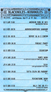BLACKOUT FA LA FESTA era il titolo che campeggiava sul manifesto blu della ennesima iniziativa a sostegno della nostra radio. Correva l’anno 2001, mancava poco più di un mese al G8 di Genova e molte energie e attenzioni erano calamitate da quell’evento. Eppure la ciurma dei centocinquedueecinquanta riuscì a mettere in piedi un programma fitto di serate musicali: una ska, due punk, una di folk occitano, una reggae dub, oltre a un mercoledì dedicato a teatro e performance, per finire l’ultimo sabato con altri concerti e i dischi Toretta Stile da Roma.