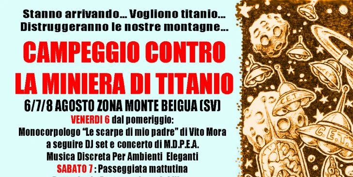 Dal 6 all’8 agosto si svolgerà un campeggio di lotta contro il progetto della miniera di titanio che minaccia di devastare il Parco del Beigua, in provincia di Savona. Con un compagno abbiamo parlato degli ultimi sviluppi di questa vicenda e del programma del campeggio che potete trovare in forma completa qui sotto.