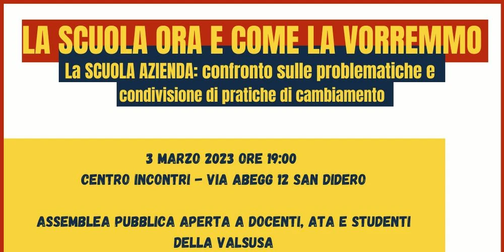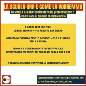 Il secondo argomento della puntata è ruotato attorno alla scuola, lo abbiamo fatto con un’intervista ad Irene del Coordinamento Docenti Valsusa partendo dalla loro assemblea tenutasi il 3 marzo intitolata “La scuola ora e come la vorremmo”. Dal testo di convocazione dell’assemblea: