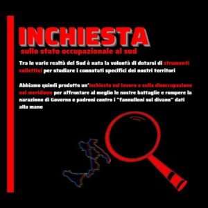 Il primo approfondimento lo abbiamo fatto in compagnia di Ivan ed Enrico dei COBAS lavoratori dello spettacolo di Bari sull’inchiesta sul lavoro e la disoccupazione a SUD: “Tra le varie realtà del Sud, che a seguito della manifestazione del 5 Novembre 2022 di Napoli hanno deciso di proseguire il confronto e la riflessione politica, è nata la volontà di dotarsi di strumenti collettivi per portare un lavoro di indagine sui nostri territori. Abbiamo quindi prodotto un’inchiesta sul lavoro e sulla disoccupazione nel meridione per affrontare meglio le nostre battaglie! ?Link inchiesta ? https://forms.gle/gQS9CSCL1zN8uTzx5 I promotori dell’inchiesta sono: Antudo-CAP 80126 – Centro Autogestito Piperno-Casa Occupata Via Garibaldi- Fgc Calabria, Fronte Comunista, LaBase Cosenza, Laboratorio Politico Iskra,Cobas lavoratori dello spettacolo Puglia-Movimento di Lotta – Disoccupati “7 Novembre”
