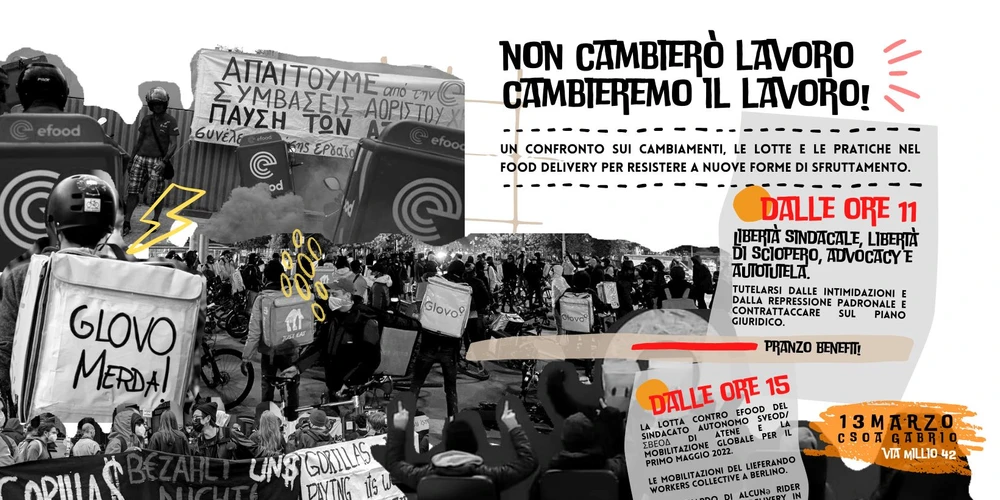 Il terzo approfondimento lo abbiamo fatto proponendo uno speciale su “Non Cambierò lavoro//Cambieremo il lavoro”, organizzato dall’assemblea dei riders torinesi, in collaborazione con l’assemblea lotte lavoro e il CSOA Gabrio, che ha ospitato l’iniziativa. Frittura mista alias Radio Fabbrica, esce dalla radio e si fa un giro al Gabrio, dal quale abbiamo voluto riportarvi integralmente e proporvi la traduzione di qualche intervento avvenuto da questo momento di formazione e dibattito in ambito di delivery in senso allargato, come andremo ad ascoltare. Gli scambi di esperienze tra lavoratori, greci, berlinesi, e italiani da varie città è stato ricco di stimoli di riflessione e discussione e per approfondirli vi consigliamo di rivolgervi alla pagina facebook di Deliverance Project .