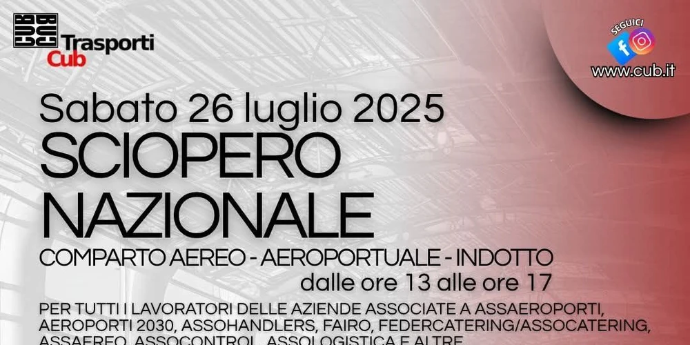 ASSOAEROPORTI, AEROPORTI 2030, ASSOHANDLERS, FAIRO, FEDERCATERING/ASSOCATERING, ASSAEREO, ASSOCONTROL, ASSOLOGISTICA E ALTRE di 4 ore per il 26/07/2025.