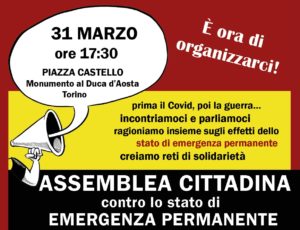 Il secondo argomento lo abbiamo trattato con Stefano, del Coordinamento Lavoratori No Green Pass, ovvero la presentazione dell’assemblea cittadina che si terrà anche questa il 31 Marzo alle ore 17:30 in Piazza Castello a Torino. Questo il comunicato ufficiale dell’iniziativa :