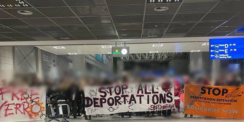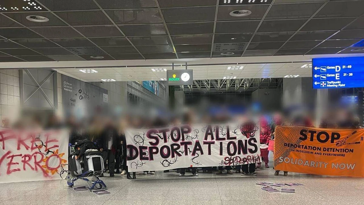 In foto: mobilitazione all’aeroporto di Francoforte contro la deportazione di Yerro, un compagno di Solimo, avvenuta ad ottobre 2025.