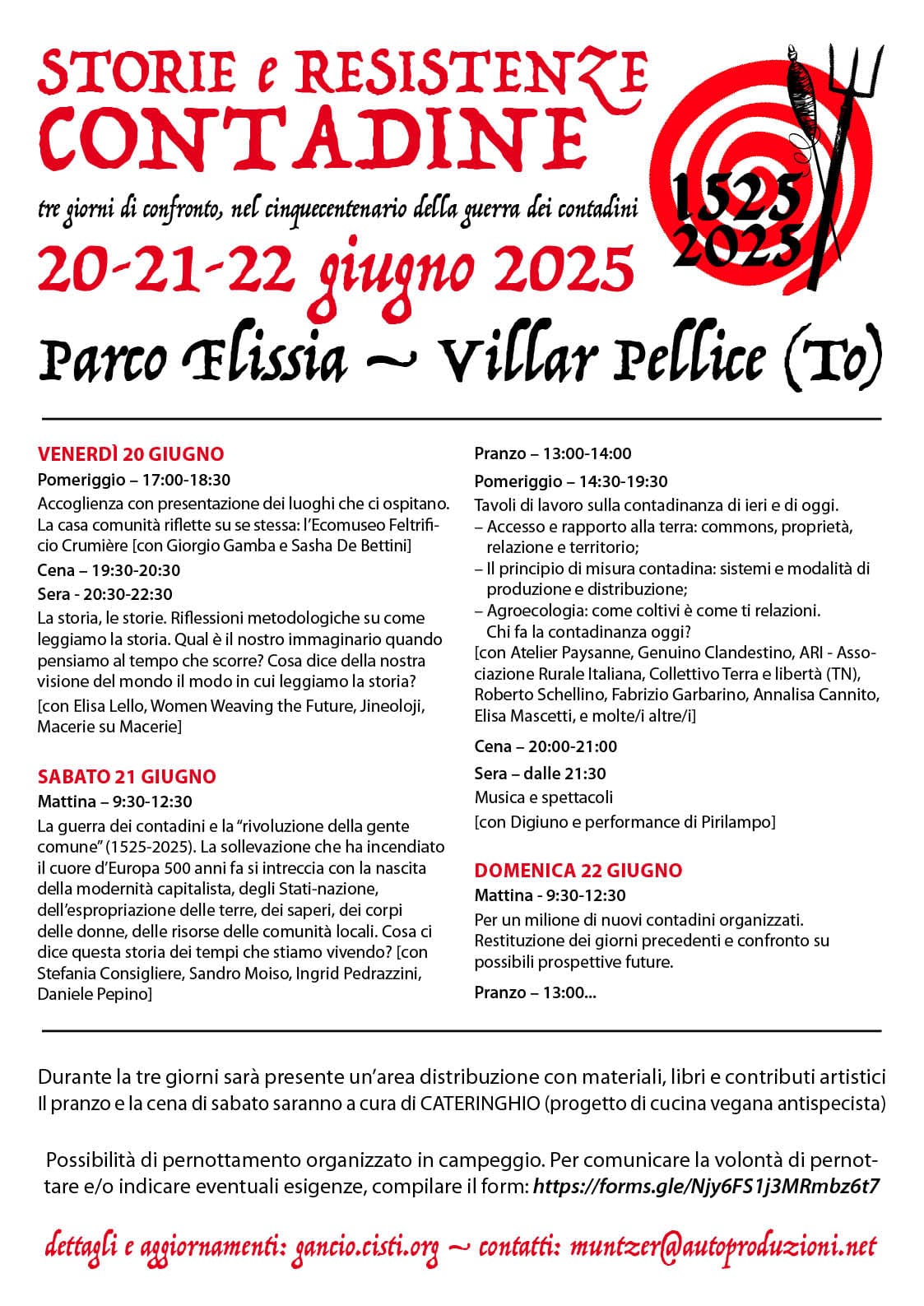 Il 20, 21 e 22 giugno a Villar Pellice ci saranno tre giorni di discussione su storie e resistenze rurali. Cogliendo l’occasione dell’anniversario dei cinquecento anni della grande guerra contadina, ci si vuole confrontare su quali siano le fondamenta del mondo in cui viviamo.