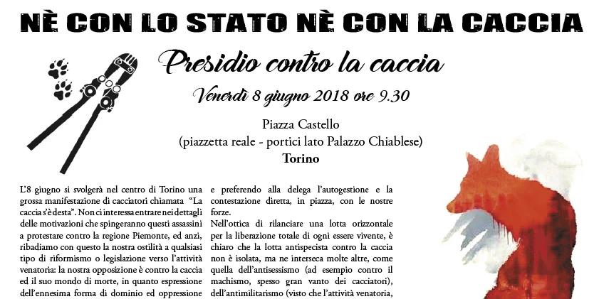 L’8 giugno si svolgerà nel centro di Torino una grossa manifestazione di cacciatori chiamata “La caccia s’è desta”. Non ci interessa entrare nei dettagli delle motivazioni che spingeranno questi assassini a protestare contro la regione Piemonte, ed anzi, ribadiamo con questo la nostra ostilità a qualsiasi tipo di riformismo o legislazione verso l’attività venatoria: la nostra opposizione è contro la caccia ed il suo mondo di morte, in quanto espressione dell’ennesima forma di dominio ed oppressione sul vivente da parte dell’essere umano, ma anche contro lo Stato, in quanto struttura repressiva e coercitiva, la cui esistenza è incompatibile con la nostra tensione verso un mondo liberato.
