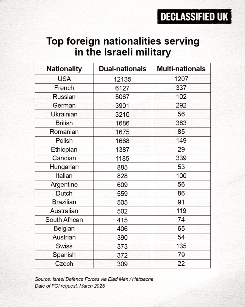 Passiamo quindi ai dati – recentemente diffusi da Declassified UK – sulla presenza di individui con doppia cittadinanza attivi nelle fila di IDF durante il Genocidio a Gaza: gli italiani sono quasi 1000. Verranno trattati come “foreing fighters” e subiranno lo stesso trattamento riservato a compagne/i partiti per supportare la resistenza kurda contro Daesh in Rojava?