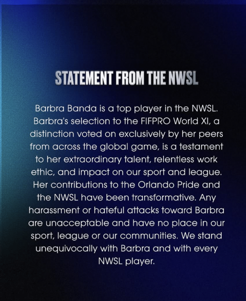 Elizabeth Eddy (Angel City FC) firma sul New York Post un editoriale in cui chiede che nella NWSL giochino solo chi superi test genetici. La lega e l’Orlando Pride difendono Barbra Banda: “Top player, ogni attacco d’odio è inaccettabile.” mentre le compagne di Eddy si dissociano: “Parole transfobiche e razziste.” La polemica esplode per la foto di Banda accanto all’articolo: “Usarla in quel contesto è offensivo e razzista.”